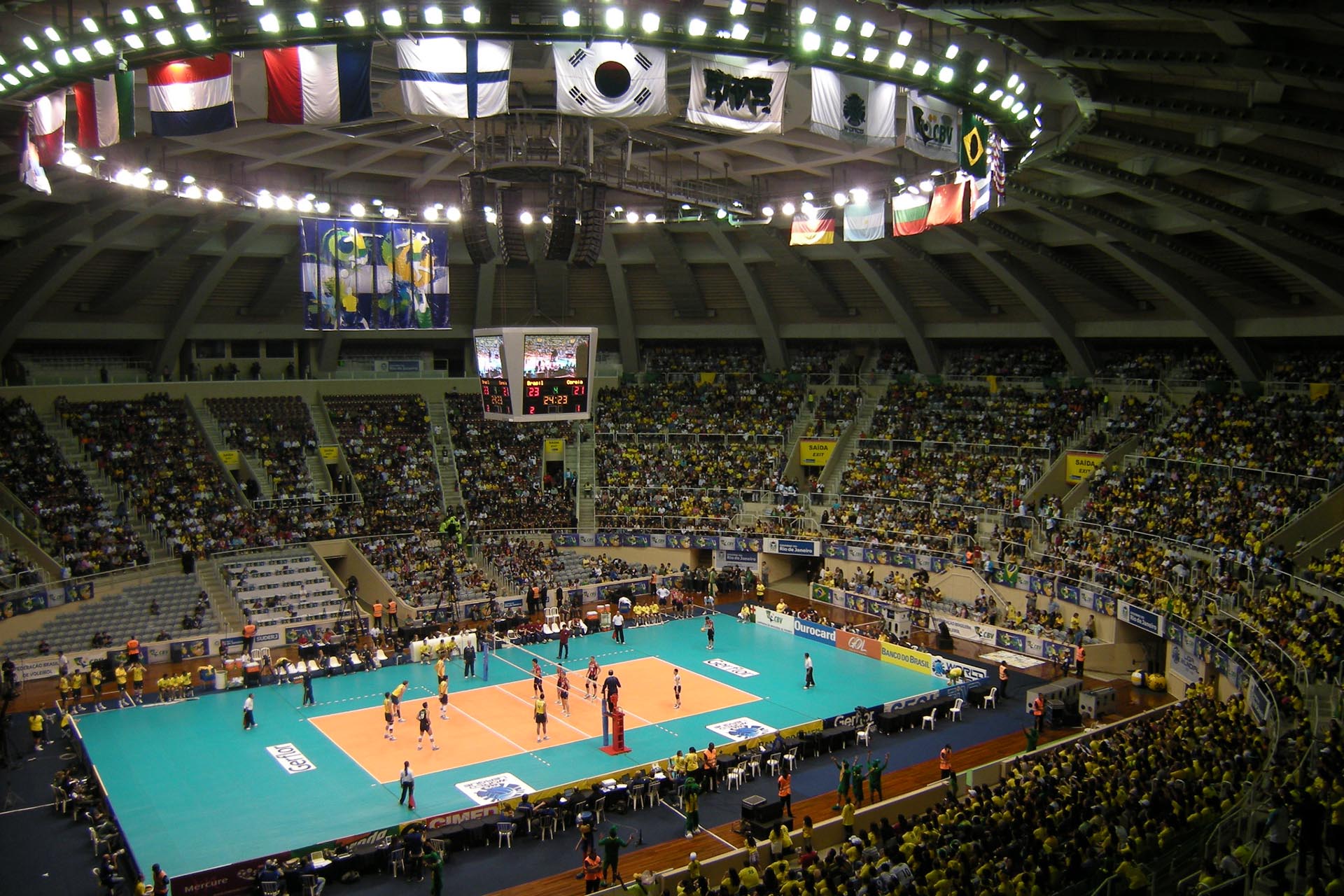 Imagens do famoso Ginásio Gilberto Cardoso no Rio de Janeiro, popularmente conhecido como "Maracanãzinho", onde a Trata Soluções Acústicas realizou diversos serviços de tratamento em prol da excelência acústica do ambiente. Além de sediar eventos esportivos, o Maracanãzinho também realiza frequentemente shows musicais e eventos artísticos em geral, exigindo assim uma qualidade acústica no mínimo impecável. (Imagens captadas na Internet).